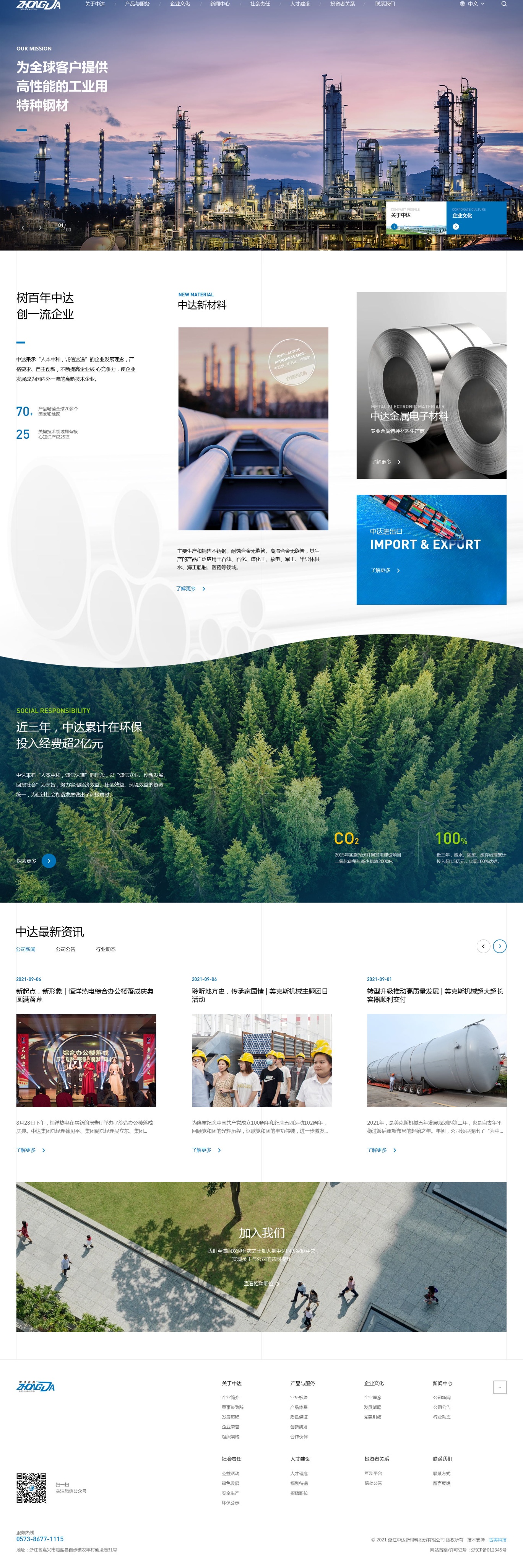 中达联合控股集团股份有限公司(以下简称“中达集团”)位于浙江省嘉兴市海盐县百步经济开发区。产业布局特钢、货架、热电、建筑、国际贸易、装备制造、三产服务等;现有8家核心子公司,在马来西亚、新加坡、俄罗斯等设有海外分公司,现有员工超2000人,设有博士后工作站。目前,集团旗下四家子公司中达材料、中达新材、中达货架、恒洋热电是浙江省“专精特新”中小企业;中达材料与中达新材又分别在2022年和2023年获评工信部专精特新“小巨人”企业。